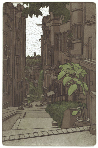 The 2024 etching and aquatint, ‘Istanbul V’ pictures a glimpse of an urban streetscape. Characteristic of Kowarsky’s style, this print is sketch-like, evoking the handmade feeling of a drawing. This print captures the dynamic energy of a traveler anticipating the day before them, looking out onto the city they will later explore. In an ode to Kowarsky’s travels abroad, this cityscape evokes the untapped potential of sites unseen, encouraging the viewer to share his sense of wanderlust.