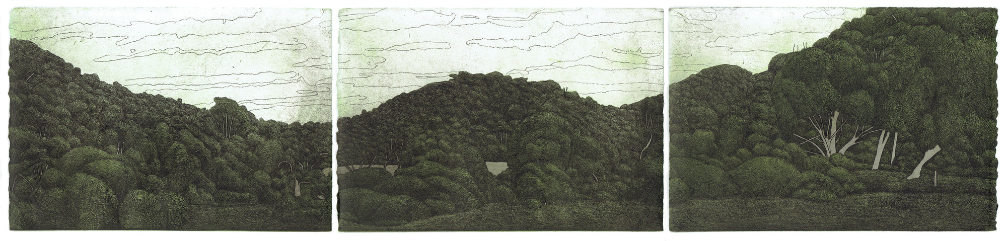 The 2022 etching and aquatint, ‘Panorama, Koroitj’ is a print in three parts, featuring an expansive panorama of Warrnambool, Victoria. Centrally representing the rolling hills of the dormant Koroitj volcano, this print focuses on the intricacies of the Australian landscape. By dividing this scene into three, Kowarsky demands we pay attention to the environment we inhabit, offering a contemplative reflection on our surroundings.