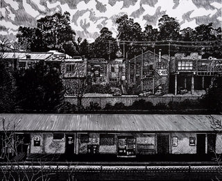 In ‘Back of the shops’, Lawry represents her local township with a touching intimacy. An otherwise mundane scene, this landscape work is a testament to Lawry’s artistic ethos to finding beauty in the minutiae of life. In this linocut, as in much of Lawry’s work, ‘Back of the shops’ is a meditation on the artist’s relationship to the local area and environment in which she exists.