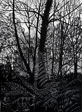 In her linocut ‘Morning light’, Lawry draws inspiration from her local area in the Dandenong ranges. This depiction of her surrounding environment is a testament to Lawry’s relationship with nature, with the wintery tree canopy and fern-filled undergrowth dramatically depicted in strong monochromatic lines. In this linocut, as in much of Lawry’s work, ‘Morning light’ is a meditation on the artist’s ability to find artistic beauty in the minutiae of life.