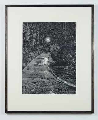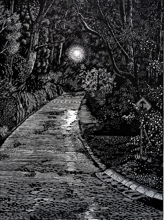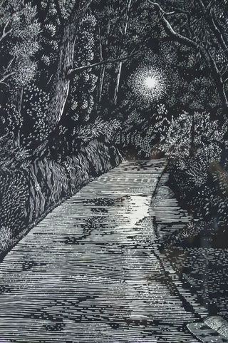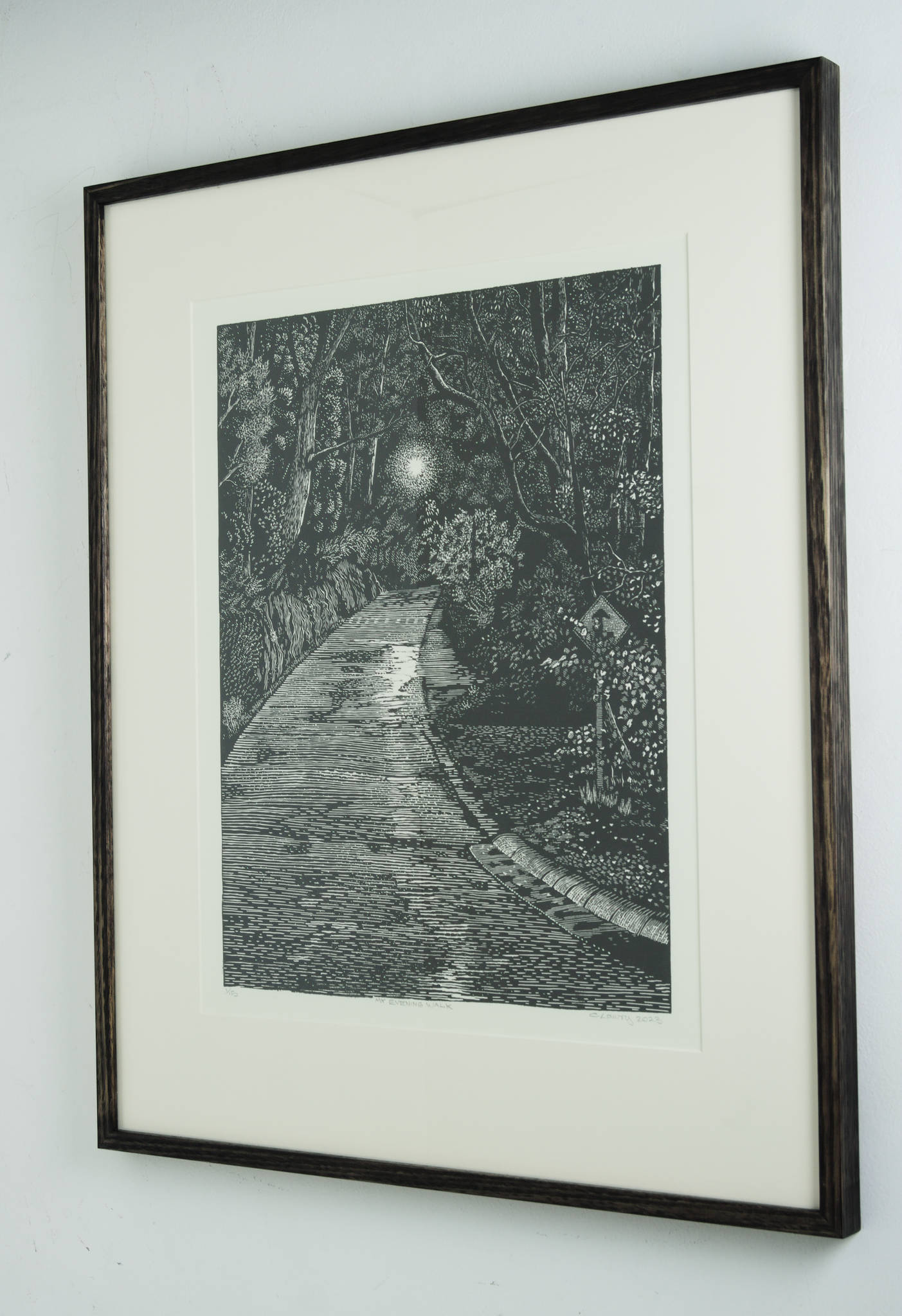 In her linocut ‘My evening walk’, Lawry provides an intimate insight into her everyday life. This depiction of her local area is a testament to Lawry’s artistic ethos to finding beauty in the minutiae of life, with the intricately-detailed scene appearing almost fantastical. In this linocut, as in much of Lawry’s work, ‘My evening walk’ is a meditation on the artist’s relationship to the local area and environment in which she exists.