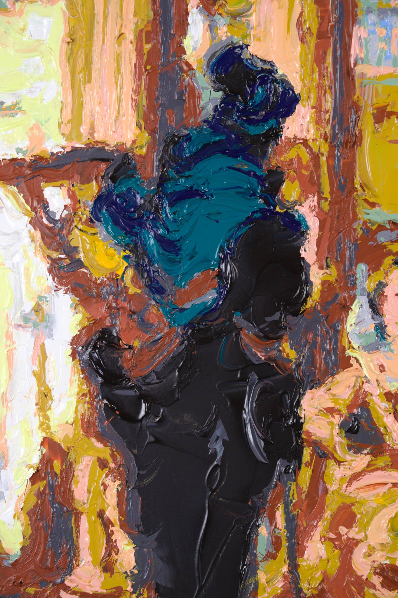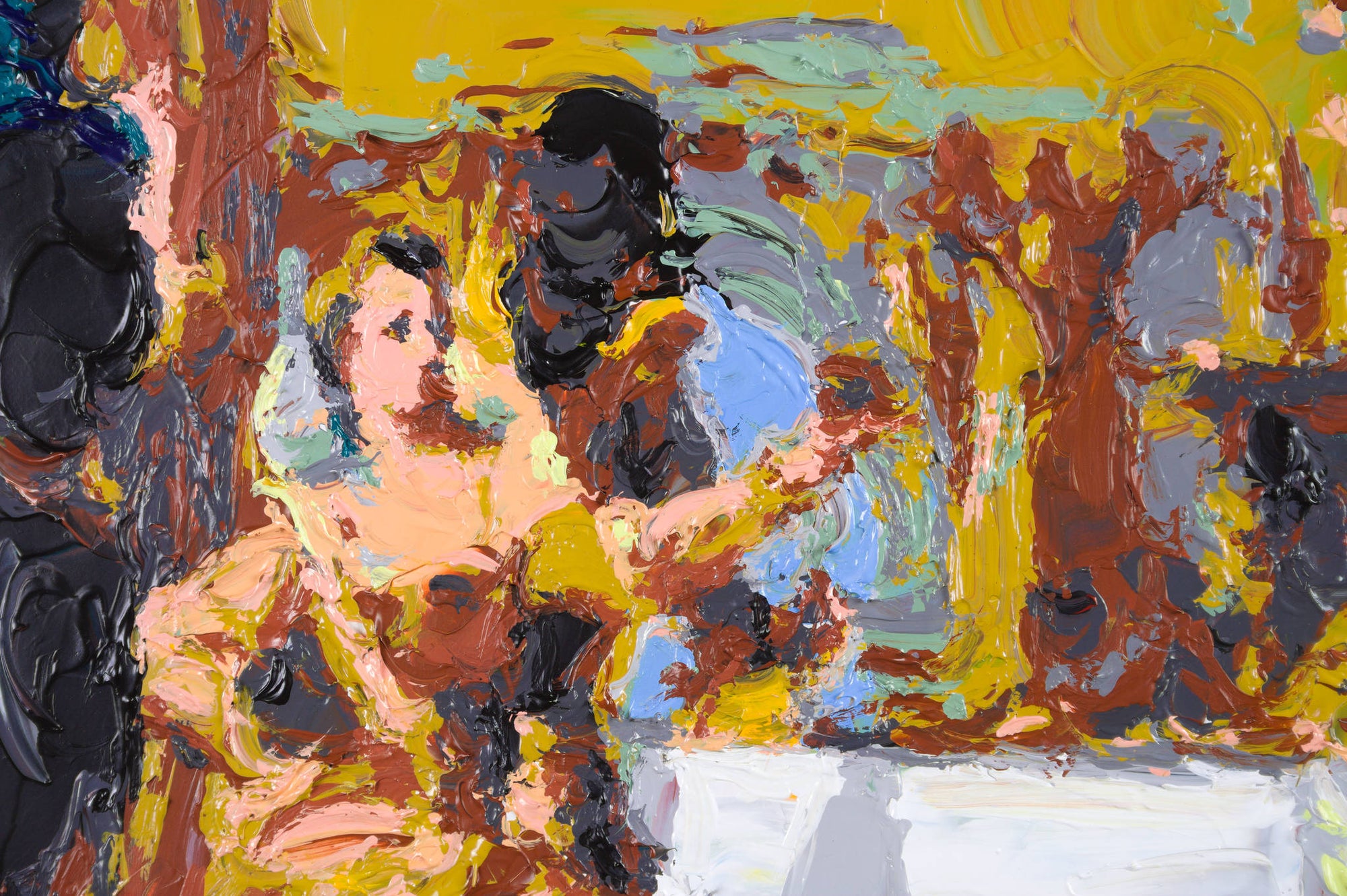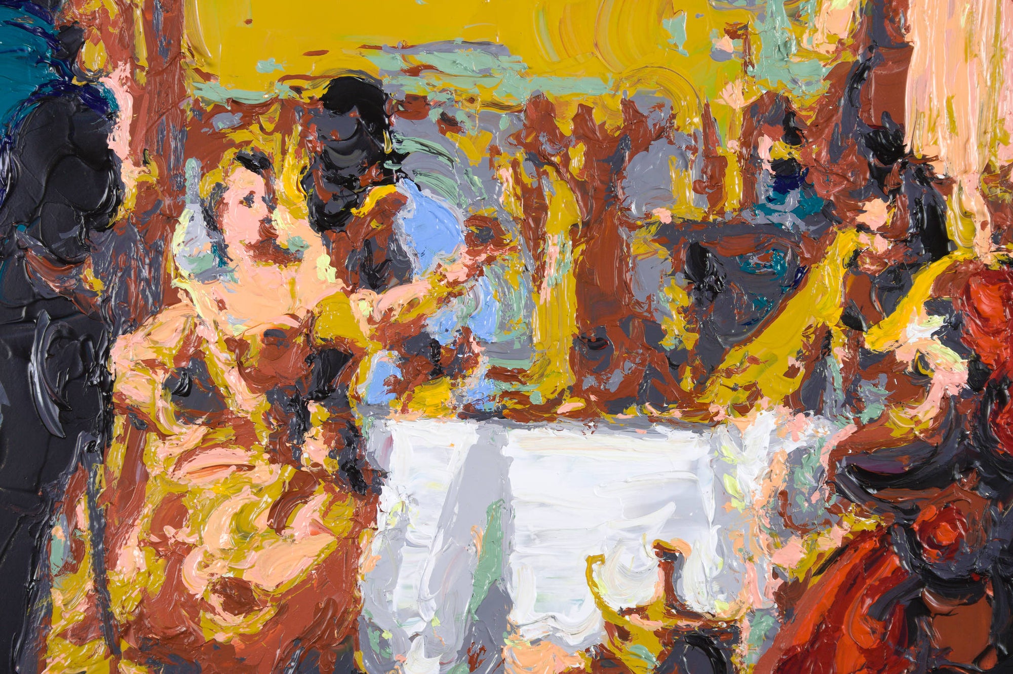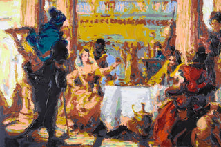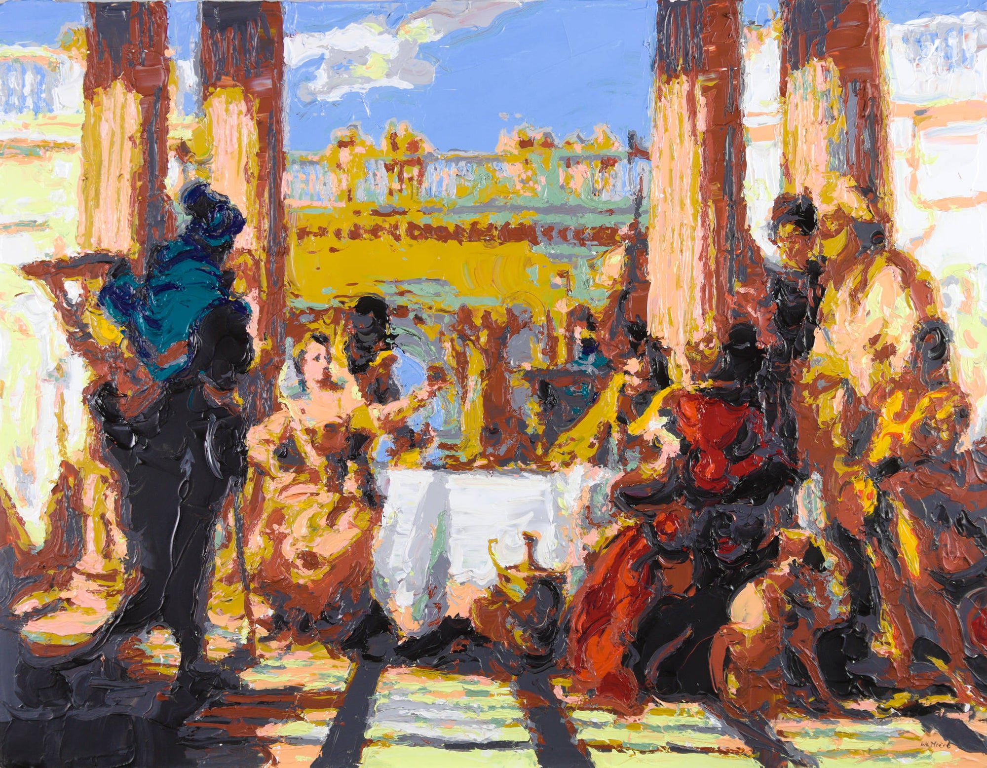 In his classic style, Le Miere creates a modern interpretation of Giambattista Tiepolo's 'The Banquet of Cleopatra', a 1743-44 painting that tells the tragically-fated story of Anthony and Cleopatra, a favourite subject of the Rococo era. This scene is one of opulence and exquisite wealth - at the end of her feast, the Egyptian queen dissolves her priceless pearl earring in vinegar to prove that she is the more lavish host. This sense of wealth is masterfully captured in Le Miere's work, with its richly textured surface and broadly layered brushstrokes creating an atmospheric sense of narrative.