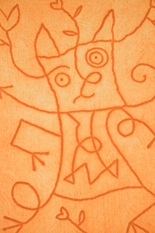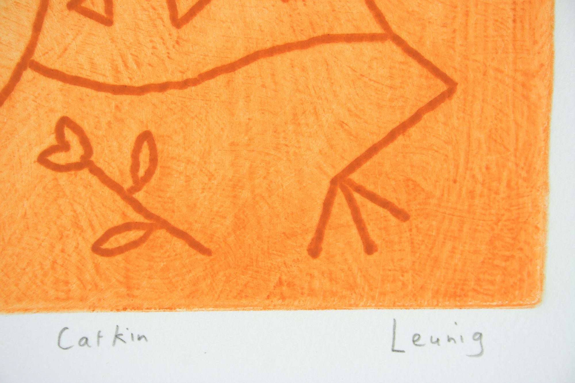 In this quintessential Leunig etching, a curious hybrid form unfurls from a field of vivid orange. Part person, part cat, part budding plant, the figure seems to grow straight out of the artist’s effortless, looping line. It’s a creature of wonder—wide-eyed, tender and a little absurd—holding the quiet, inner magic that runs through Leunig’s world.