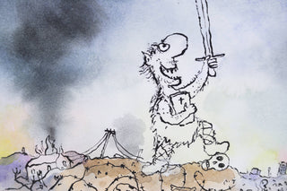 ‘Onwards to Mars and the Moon’ is an original mixed media work, quintessentially Leunig. Creating a post-apocalyptic scene, this work reflects Leunig’s signature blend of deadpan humour and philosophical sadness, with a crusading single figure appearing to stand on the rubble of humanity, aiming to conquer distant planets. Satirical and shocking, this work powerfully critiques the ongoing destruction of our planet. Part lament, part commentary, this is a powerful work for those who appreciate the delicate balance of humour and despair that defined Leunig’s art.