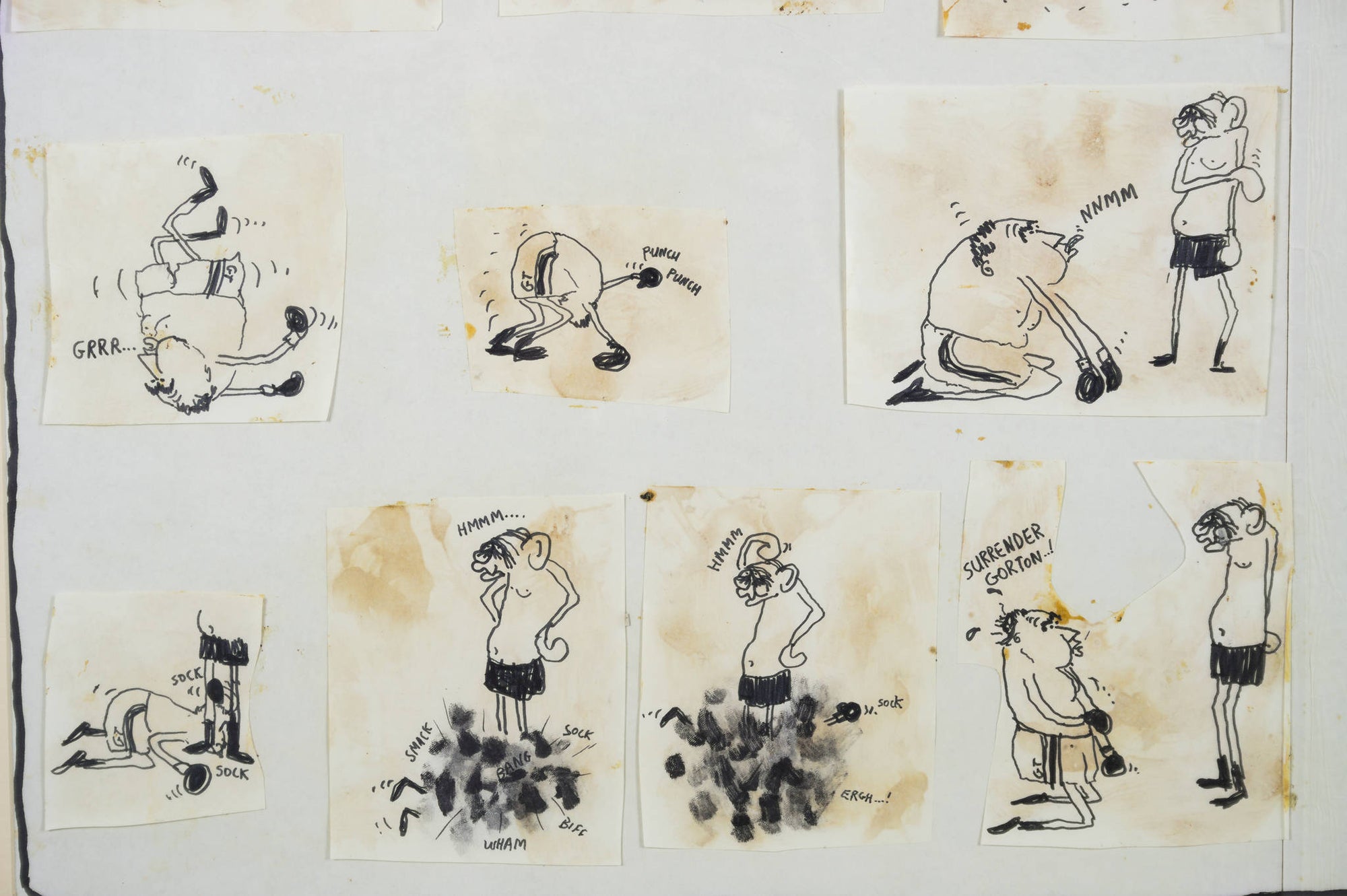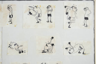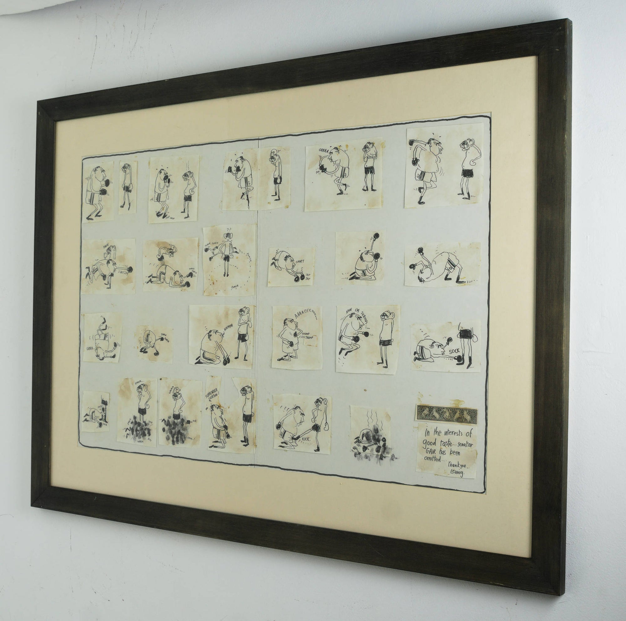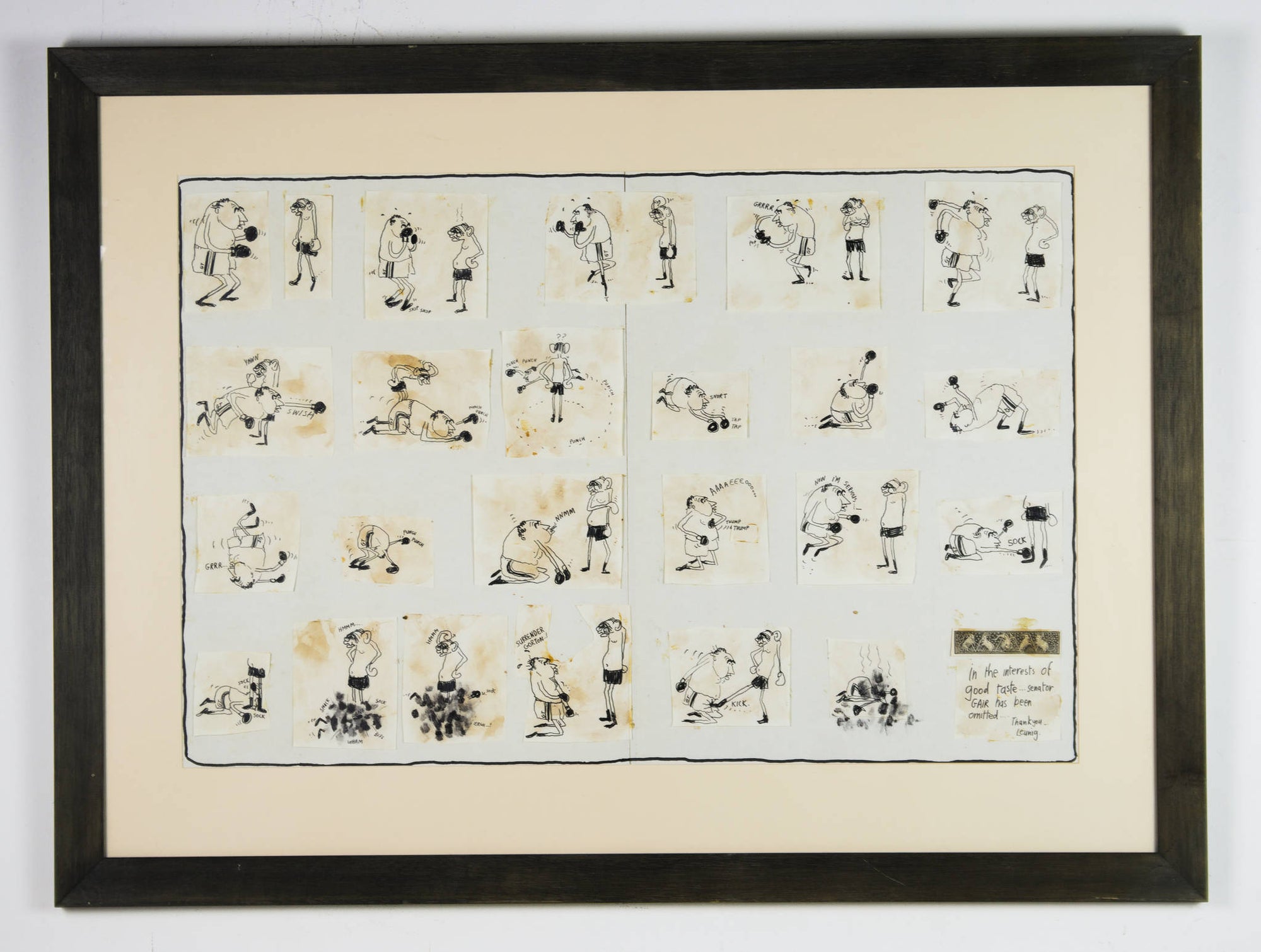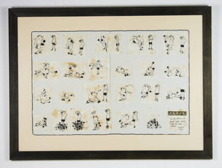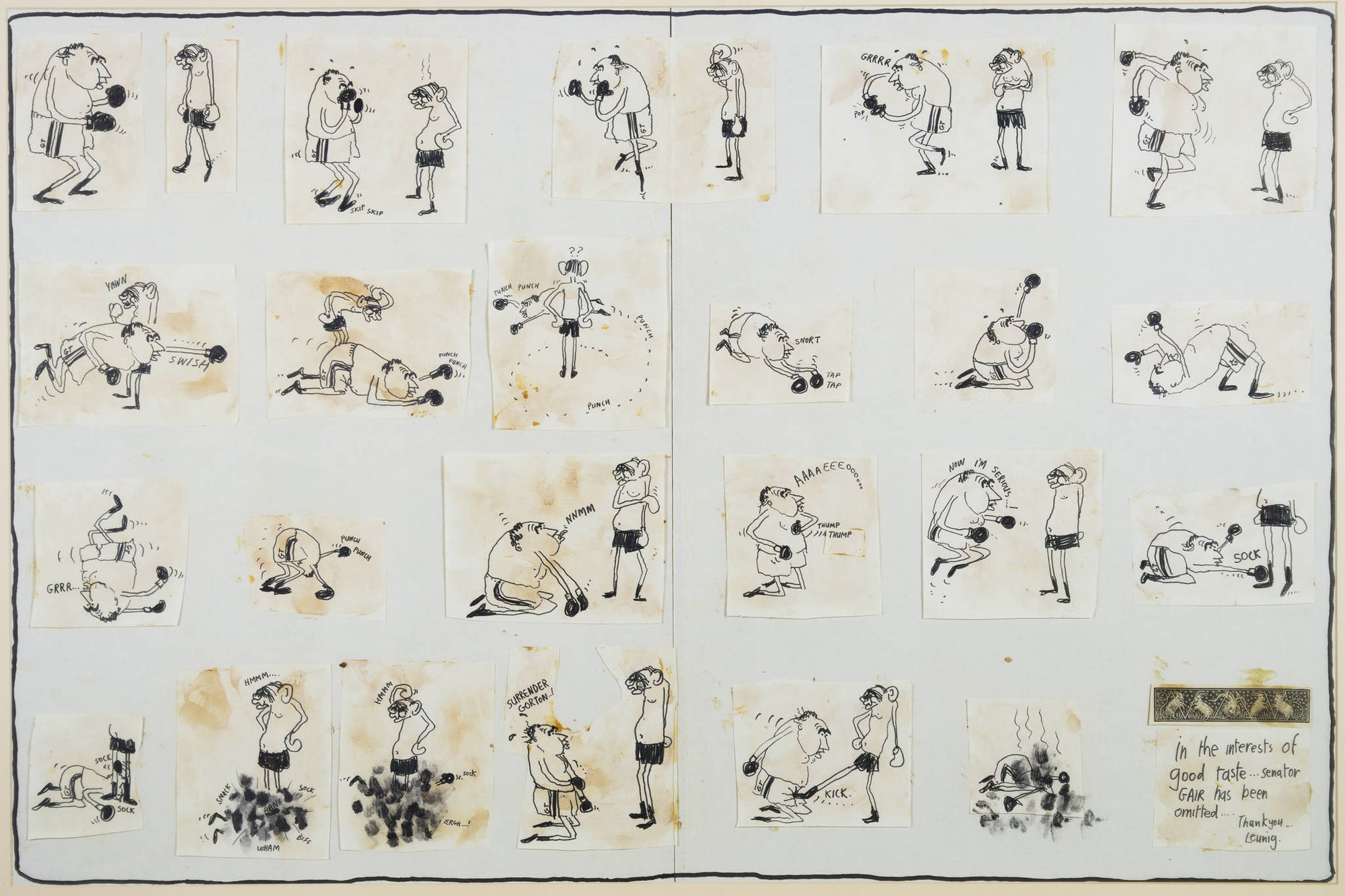 In ‘Untitled (Senator Gair)’, Leunig represents the adversarial relationship between Senator Vince Gair and Prime Minister John Gorton as one-sided boxing match. Richly contextualised by the 1969 Australian political landscape, there is a timeless humour that exists with this cartoon. Assembled from individually drawn panels, and signed off from the witty voice of the artist himself, this work is classically Leunig and vividly reflective of his artistic process.
