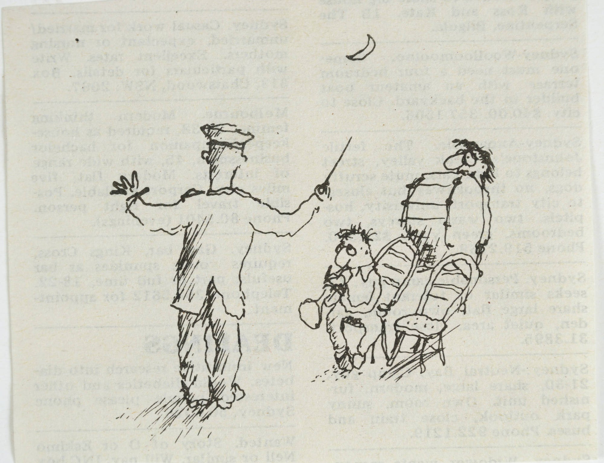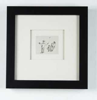 Executed on newspaper, Untitled (Disbanded) reflects the immediacy and openness of Leunig’s artistic process. In this original drawing, he depicts a two-person band almost overwhelmed by their instruments, led by an enthusiastic conductor. The empty chair introduces a gentle note of melancholy, softened by Leunig’s unmistakable sliver of moon.
