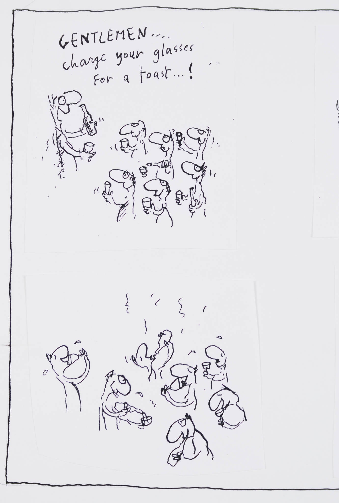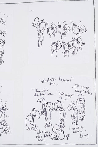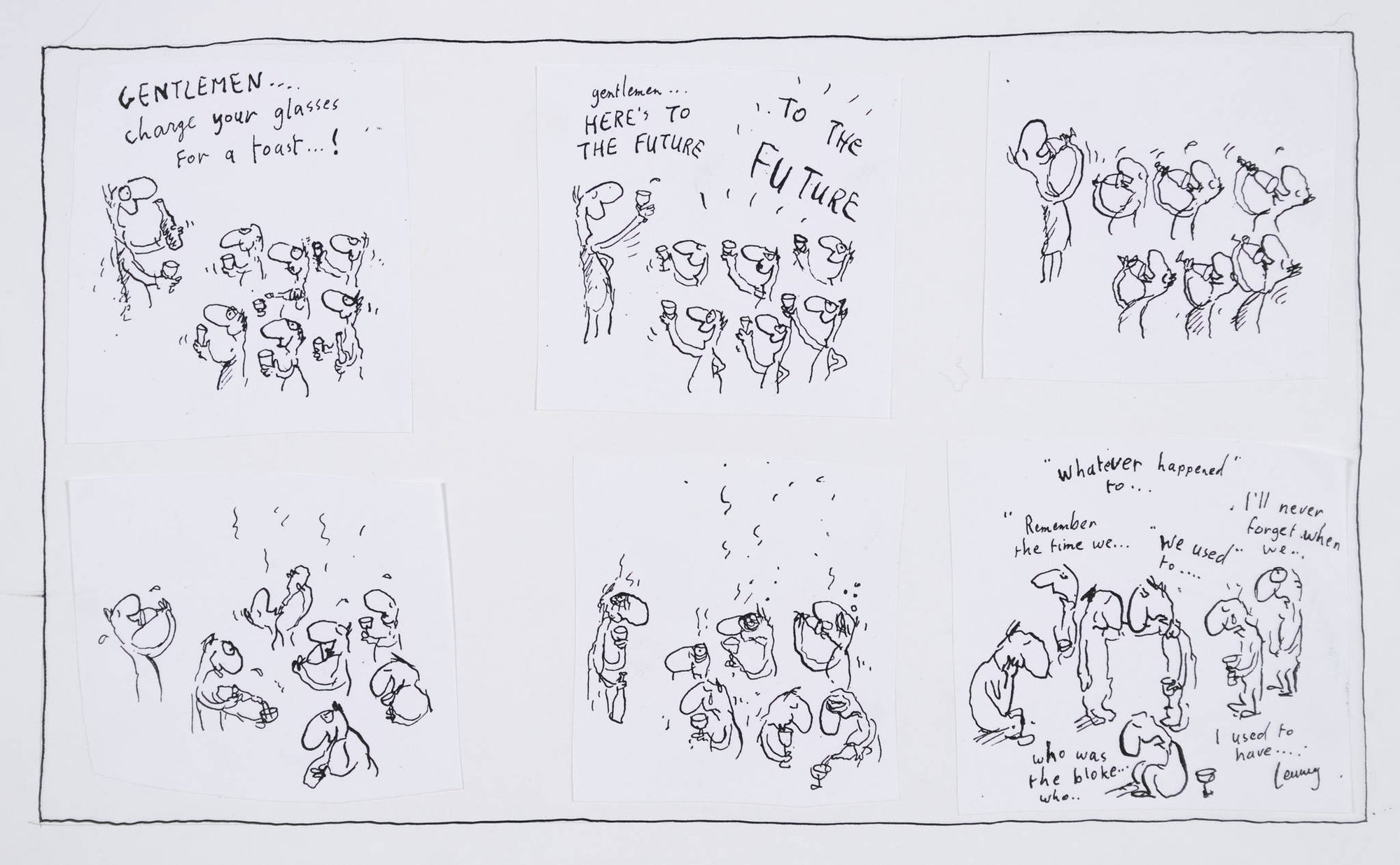 ‘Untitled (Extra Vintage)’ is an original drawing for a cartoon that is composed of six individual panels. Using the cartoonist’s signature witty style, this work presents a comedic scene - a party of friends toasting to the future, then moments later drunkenly reverting to dwelling on the past. As with many of his works, Leunig uses this cartoon to humorously explore the quirks and contradictions of human behaviour.