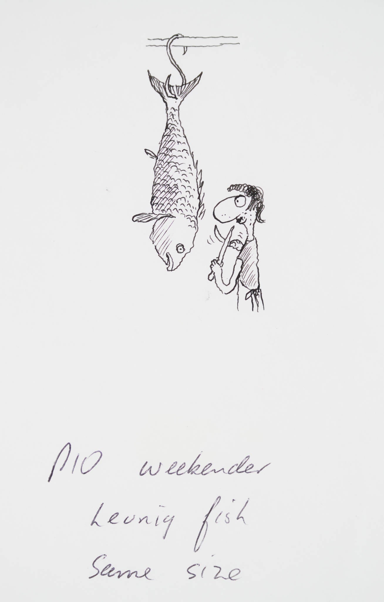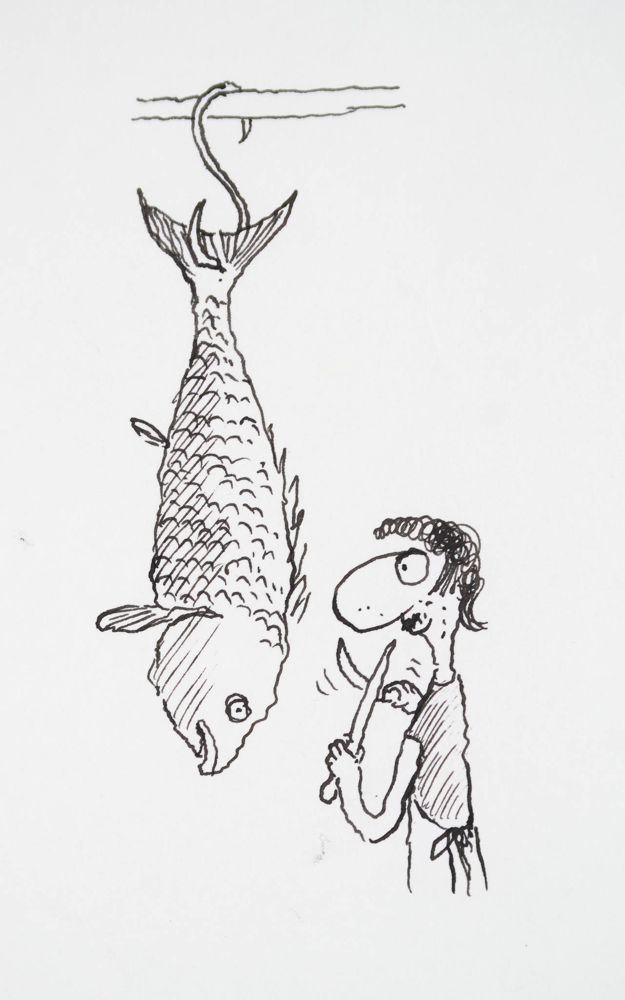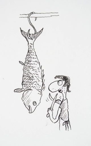 In ‘Untitled (fish hook)’, Leunig creates a small yet humorous scene. A classic ‘Leunig man’ stands poised before a large fish hanging upside down, caught in a meat hook. Using his signature style, Leunig instantly creates a sense of narrative - with the butcher’s gleeful anticipation strongly contrasted by the fish’s wide eyes and look of horror. This petite 9 × 6 cm is a testament to Leunig’s ability to create intrigue on any scale.