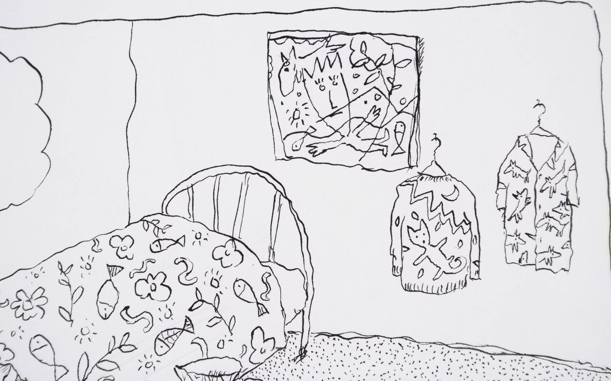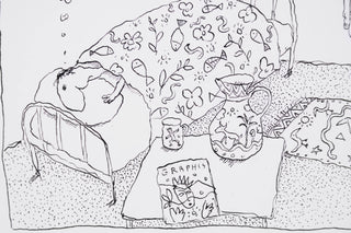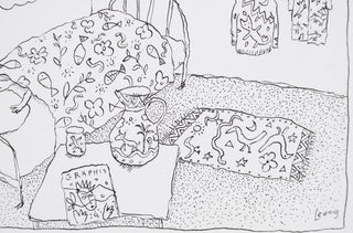 This original drawing is a delightful showcase of Leunig’s trademark humour. A devoted ‘Leunig fan’ sleeps soundly in a room filled with Leunig-branded objects - from water jugs to bedspreads - each adorned with the artist’s familiar motifs. In imagining a home where everything can be ‘Leunig’, the cartoonist playfully turns his gaze on himself. Self-aware and lightly self-deprecating, the work offers a wry commentary on artistic identity and the pull of consumerism.