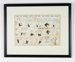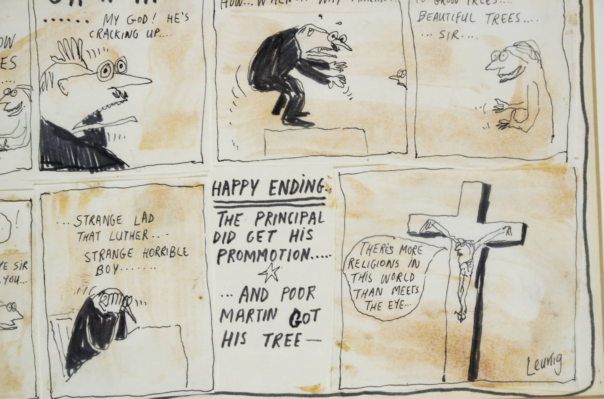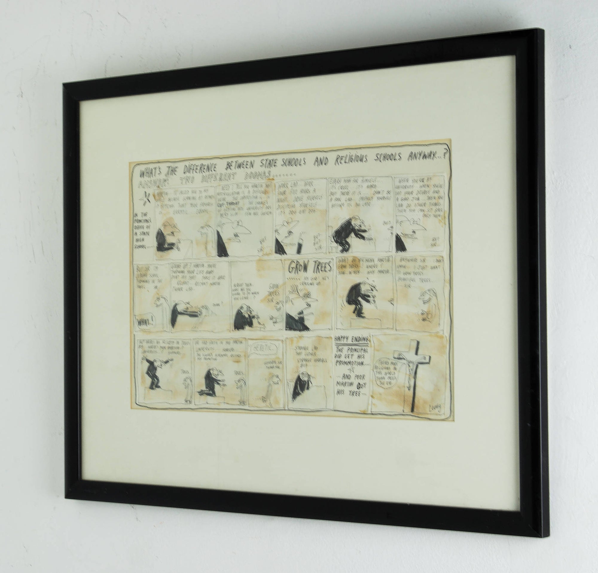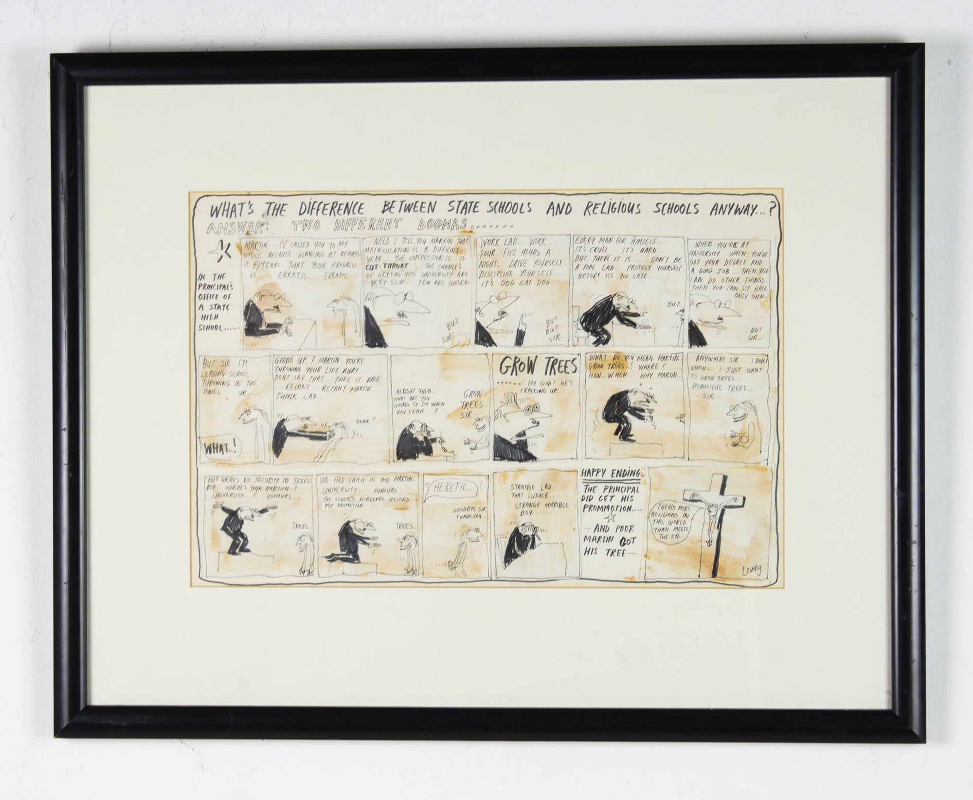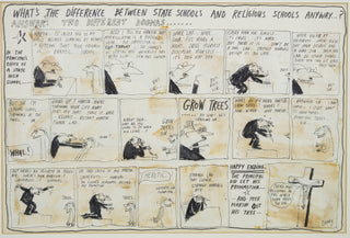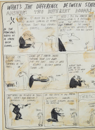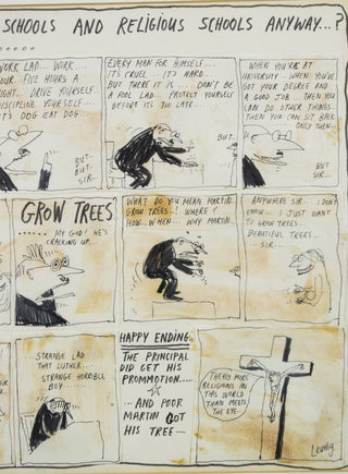 In ‘Untitled (State Schools and Religious Schools)’, Leunig uses his signature satirical style to take a critical lens to the formal structures and attitudes of high schools. Illustrating a comedic scene between an ambitious high school principal and a failing Year 12 student, Leunig humorously alludes to the skewed priorities of school systems in 1969 Australia, a sentiment that still remains relevant today. Assembled from individually drawn panels, and signed off from the witty voice of the artist himself, this work is classically Leunig and vividly reflective of his artistic process.