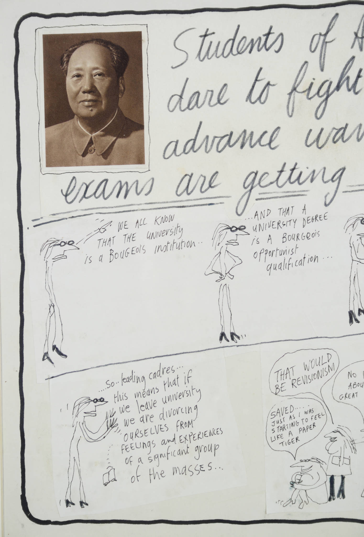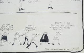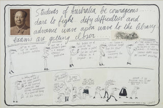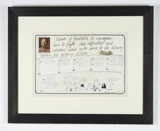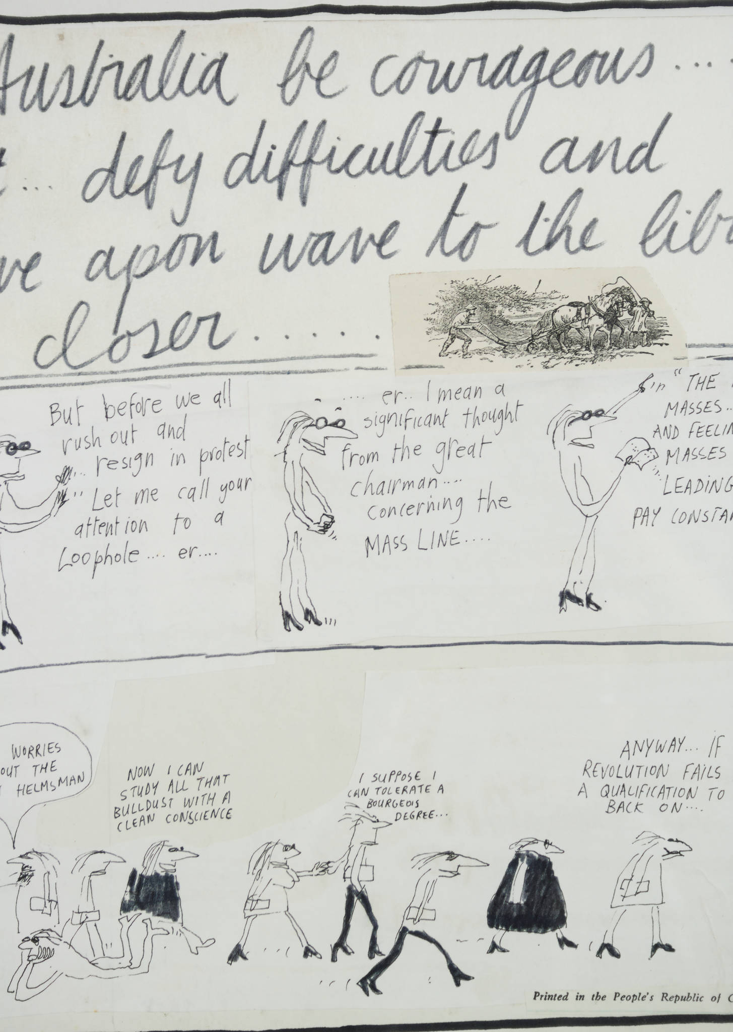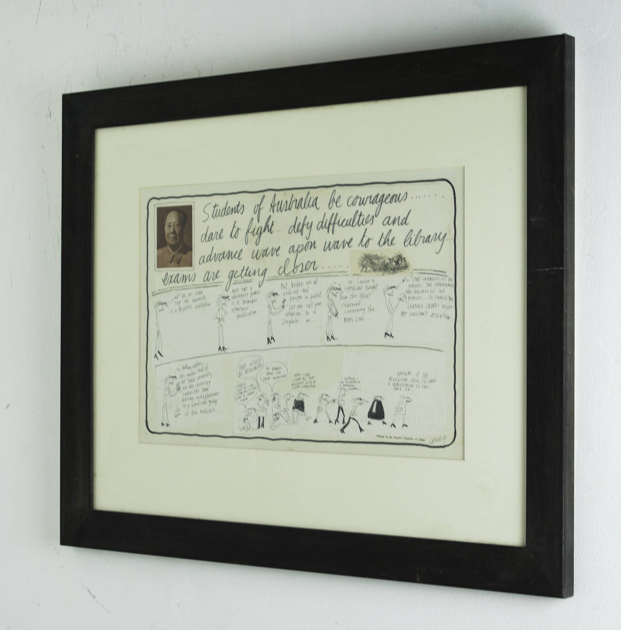 In ‘Untitled (Student of Australia)’, Leunig uses his signature satirical style to take a critical lens to the rise of Marxism and Communism within University campuses. Richly contextualised by a 1969 Australia, Leunig’s reflections still remain relevant, illustrating the ironies and contradictions that are prolific throughout university political environments. Assembled from individually drawn panels, and signed off from the witty voice of the artist himself, this work is classically Leunig and vividly reflective of his artistic process.