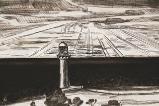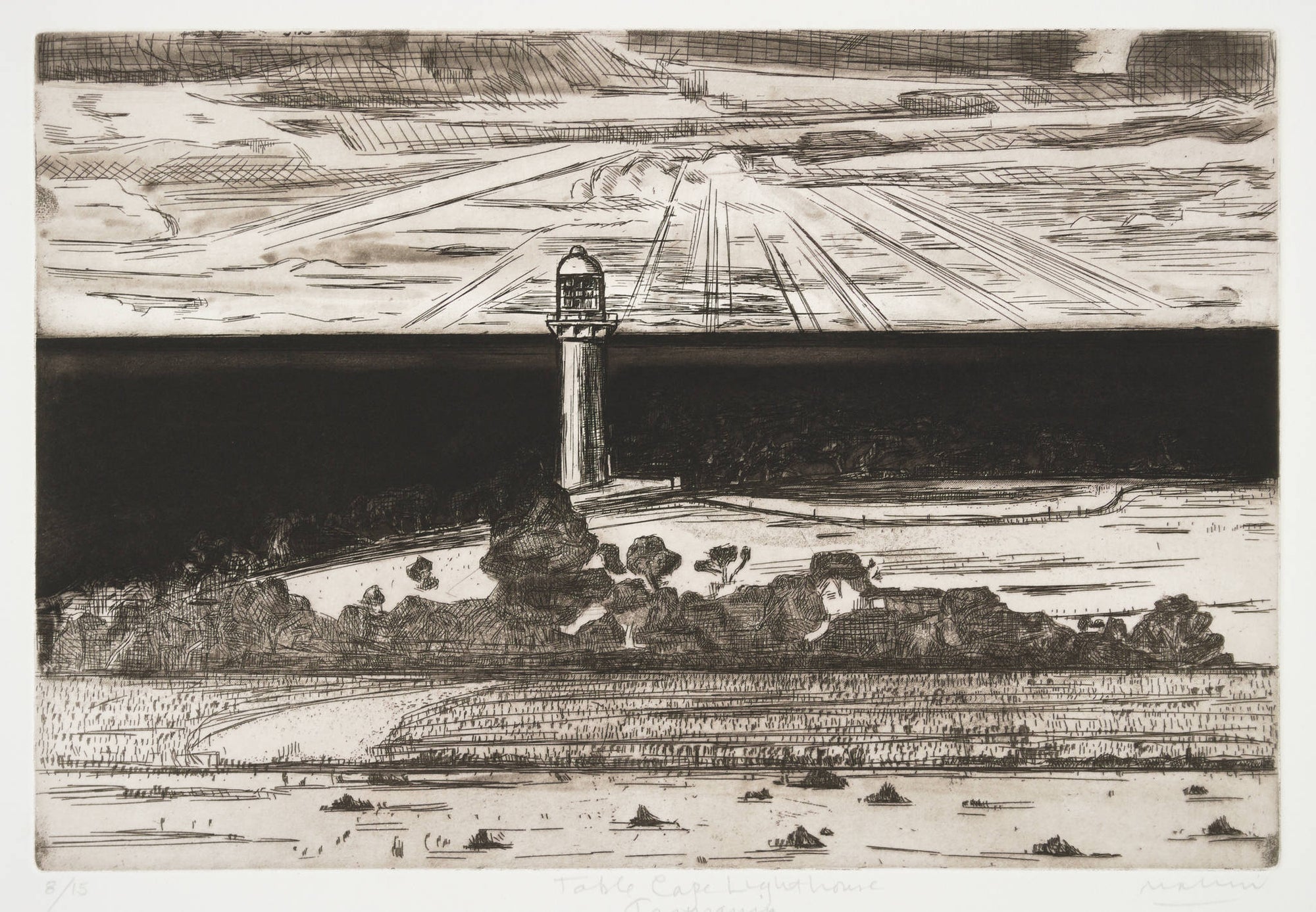 For Makin, the landscape offers complexity, history and personality. In his ‘portraits’ of natural landscape, he carves out their character, knowing better than most how much experience defines place. In 'Table Cape Lighthouse Tasmania', the central lighthouse is a dominating figure in the landscape - commanding attention and breaking through the extensive vastness of the ocean behind it.