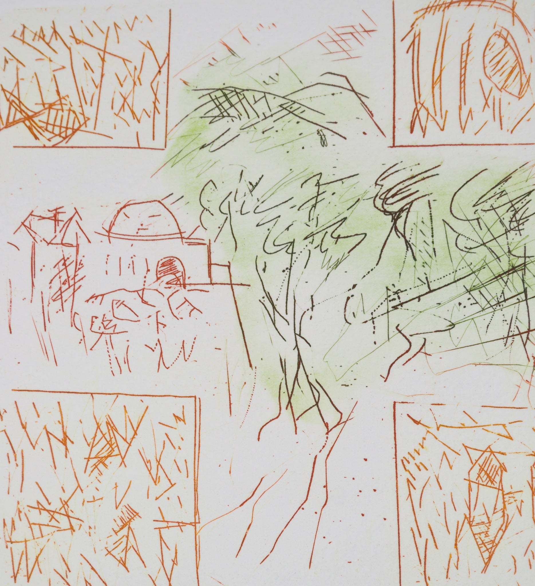 In 'Orlah', Meyer transforms a fleeting observation into a deeply contemplative meditation. The etching’s divided composition draws the eye to a central green space, juxtaposed with a building crowned by a domed roof, forming a quiet tension between nature and architecture. Executed in his signature fine, sketch-like lines, the work feels at once diaristic and spiritual, as though Meyer has recorded a private moment of reflection during his journeys.