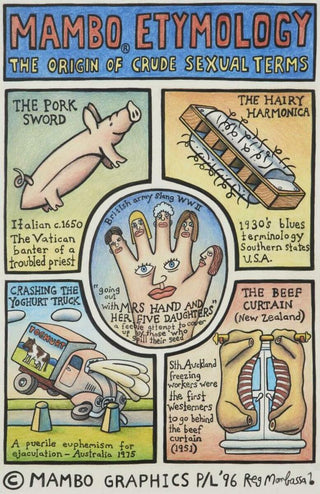 In Mombassa's 'Mambo Etymology - The Origins of Crude Sexual Terms', the artist's sense of humour takes the forefront. Under the guide of being informative, Mombassa's etymological guide shocks and offends audiences, all whilst making them laugh.