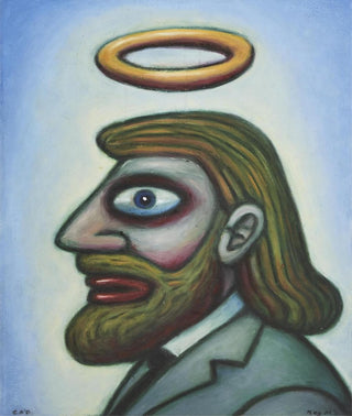 In this cartoon portrait of a man crowned with a halo, Mombassa’s humour does the heavy lifting. With a wink rather than a wagging finger, the image playfully subverts ideas of sainthood, virtue, and moral authority, gently blurring the line between the sacred and the everyday. The halo, or 'plastic ring', becomes less a symbol of perfection than a prompt to laugh at our own myths and ideals, and at the human tendency to elevate the ordinary.