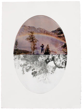 In Parker-Smith’s ‘Precariously Yours 1’, the artist creates a richly-layered composition that explores the human relationship with the environment. By dividing her image into two halves, the artist creates two contrasting visual realms. In the top half of her work, Parker-Smith draws from archival material by utilising a stylised ‘vintage’ screenprint - an image of a solitary figure surrounded by vividly-coloured nature. Below this figure sits a monochromatic etching, one of highly-detailed leaves, flowers and twigs. In ‘Precariously Yours 1’, as with many of Parker-Smith’s works, the artist uses this striking visual contrast to create a complex narrative that addresses ecological fragility and human connection to, and destruction of, the natural environment.