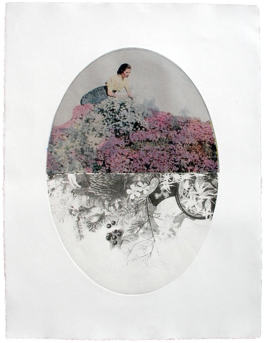 In Parker-Smith’s ‘Precariously Yours 2’, the artist creates a richly-layered composition that explores the human relationship with the environment. By dividing her image into two halves, the artist creates two contrasting visual realms. In the top half of her work, Parker-Smith draws from archival material by utilising a stylised ‘vintage’ screenprint - an image of a 1950s housewife, perched above a flowering plant. Below this image sits a monochromatic etching, one of highly-detailed leaves, flowers and twigs. In ‘Precariously Yours 2’, as with many of Parker-Smith’s works, the artist uses this striking visual contrast to create a complex narrative that addresses ecological fragility and human connection to, and impact on, the natural environment.
