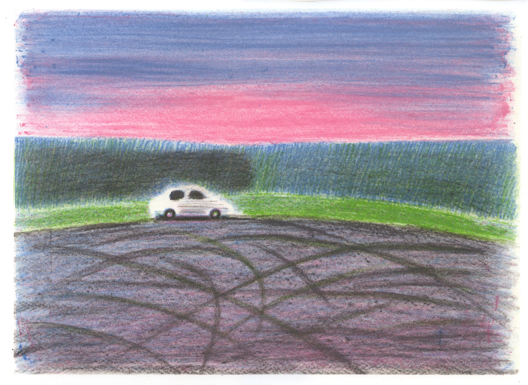 In ‘Burnouts’, the artist represents a humorous scene - a car sitting solitary in a sunset landscape surrounded by a tire-marked road, evidence of the vehicle’s ‘burnout’ carnage. Through this work, Pavlidis depicts this stereotypically masculine pastime with a palpable sense of youth. Colourful and energetic, this lithograph is an acute reflection of Pavlidis’ artistic ethos of finding artistic beauty in the everyday.