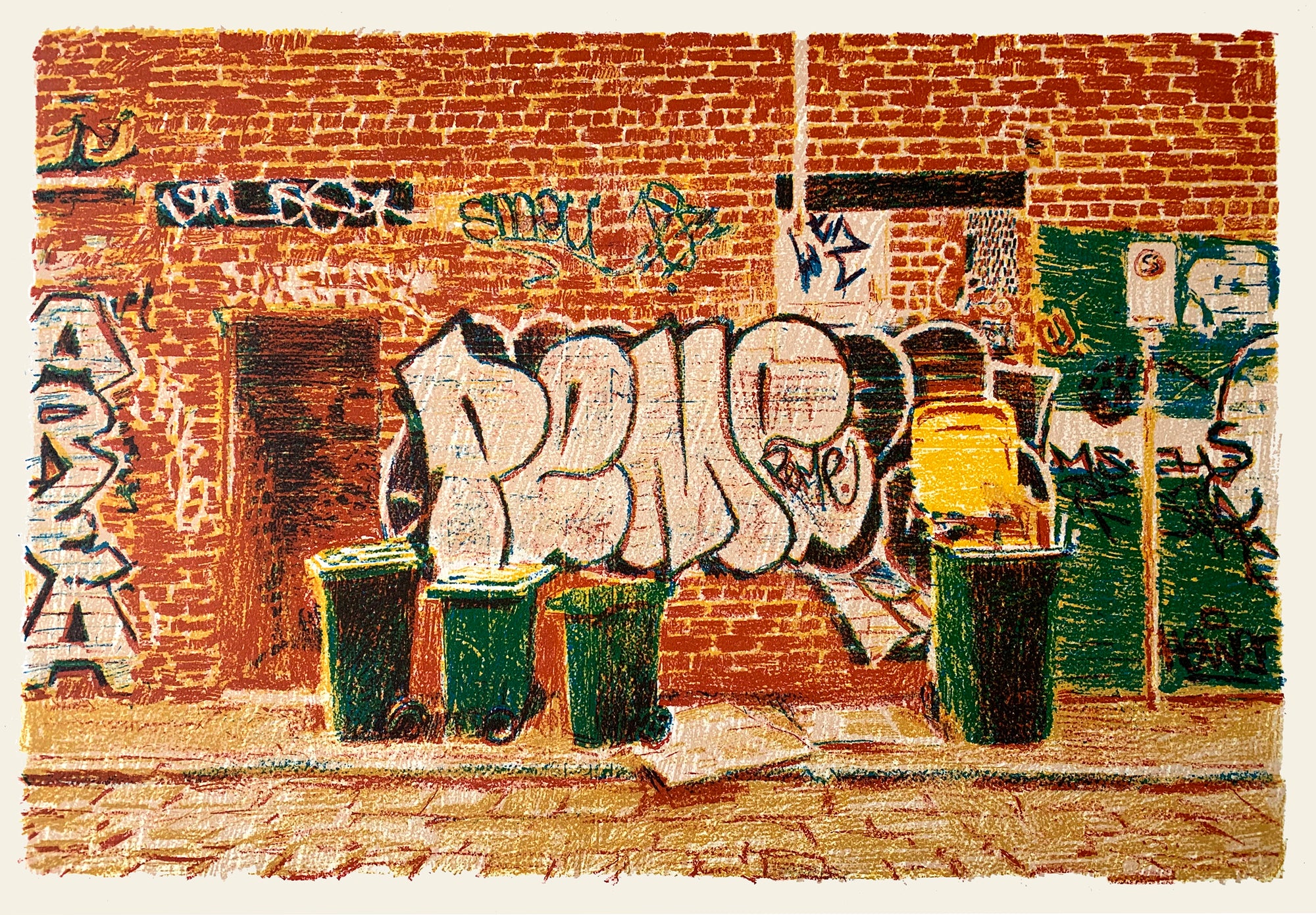 In ‘Opera’, the artist represents a banal scene of Melbourne urban living - against a graffiti-ridden brick wall, four rubbish bins stand to attention. Humourously titled ‘Opera’, Pavlidis creates a sense of narrative, with the artist re-imagining the open rubbish lid as a solo singer, belting out an aria. Vibrant and energetic, this lithograph is an acute reflection of Pavlidis’ artistic ethos of finding beauty in the everyday.