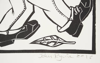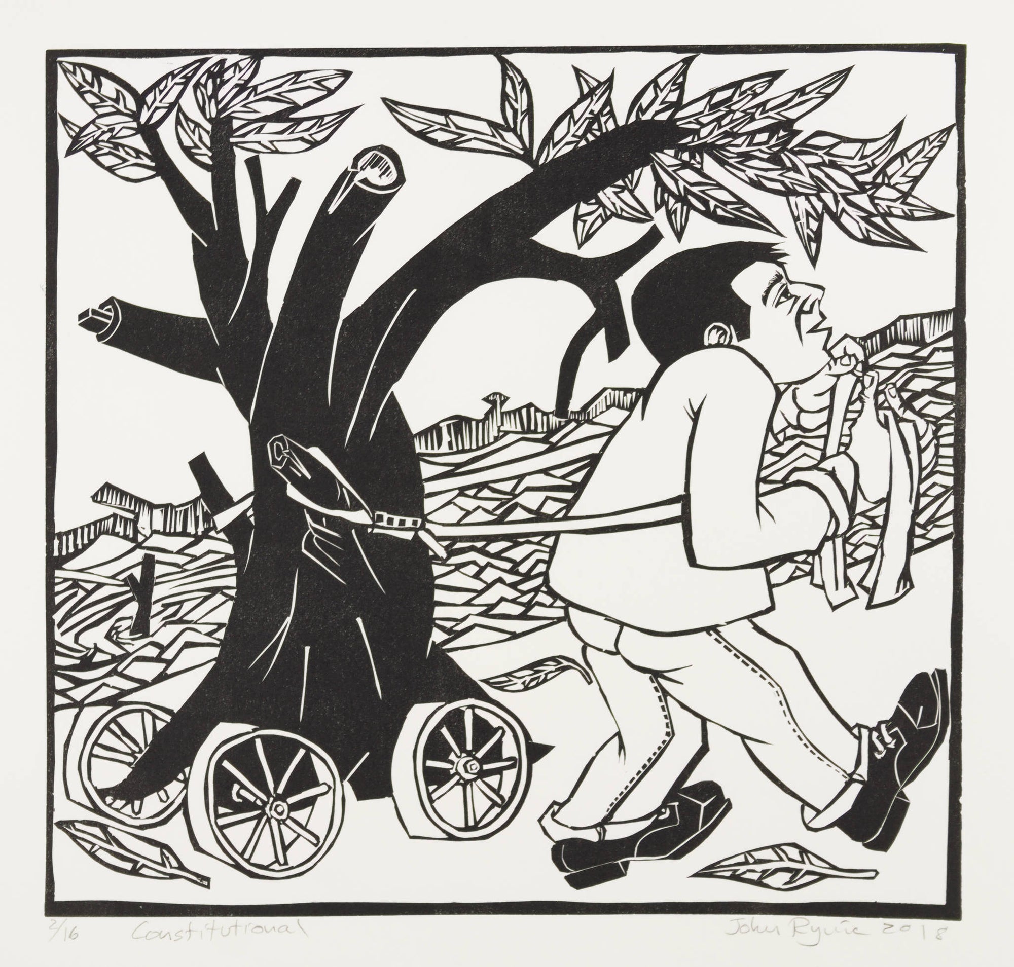 John Ryrie’s work is underpinned by an affinity for printmaking. He is drawn to symbolism and expressionism, in particular the woodcuts prints of late 19th century Edvard Munch (the artist best known for ‘The Scream’), Japanese artist Shiko Munakata and William Blake. Ryrie’s ‘Constitutional’ is imbued with absurdity and ironic humour, providing a powerful allegory of futile labor and the stubborn resistance to change.