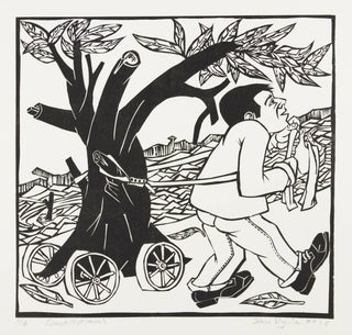 The tree—a symbol of tradition, history, and nature—has been uprooted and crudely mobilised. A man strains under the burden of a thick harness, attempting to pull the large tree which rests on four small, inadequate wheels. This action represents the Sisyphean and seemingly futile task of modern progress; the effort required to uphold or drag cumbersome, historical frameworks into a new landscape.