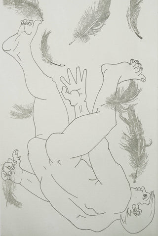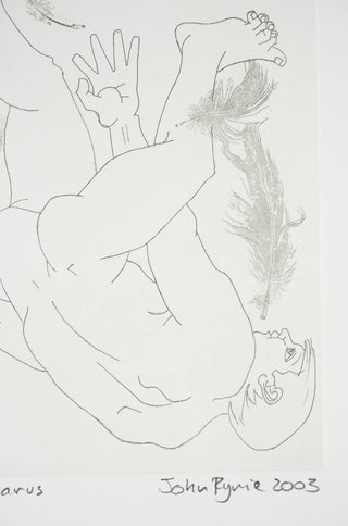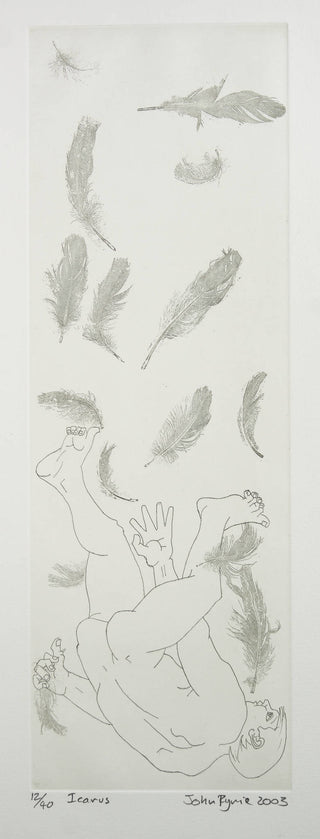 Ryrie’s etching captures the melodrama of Icarus’ fall to earth with an unexpected sense of grace and beauty. The feathers, a representation of Icarus’ melted wings, float downward in contrast to the figure, reminding one of the dark finality of Icarus's fate: the consequence of flying too close to the sun.