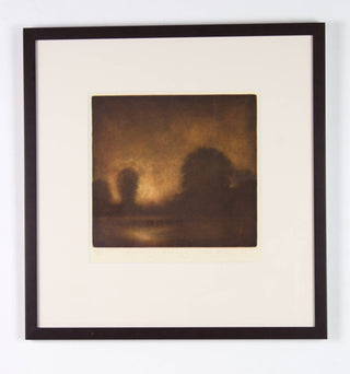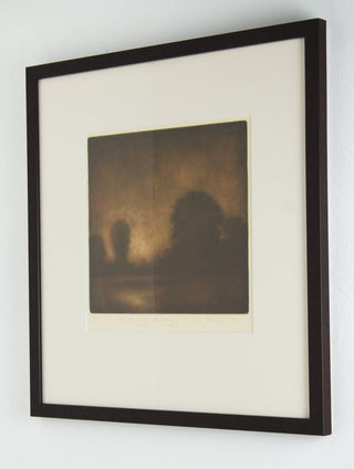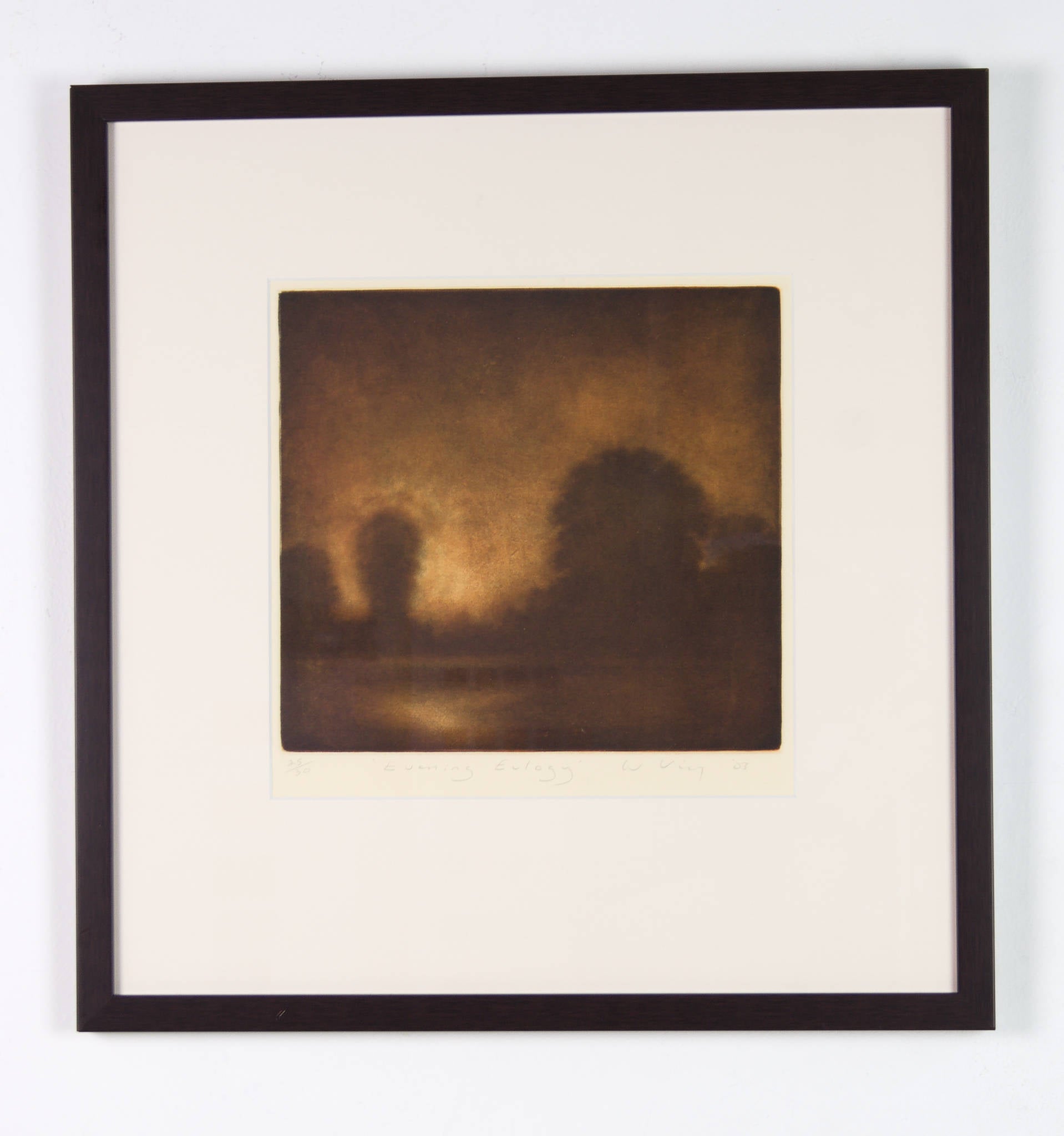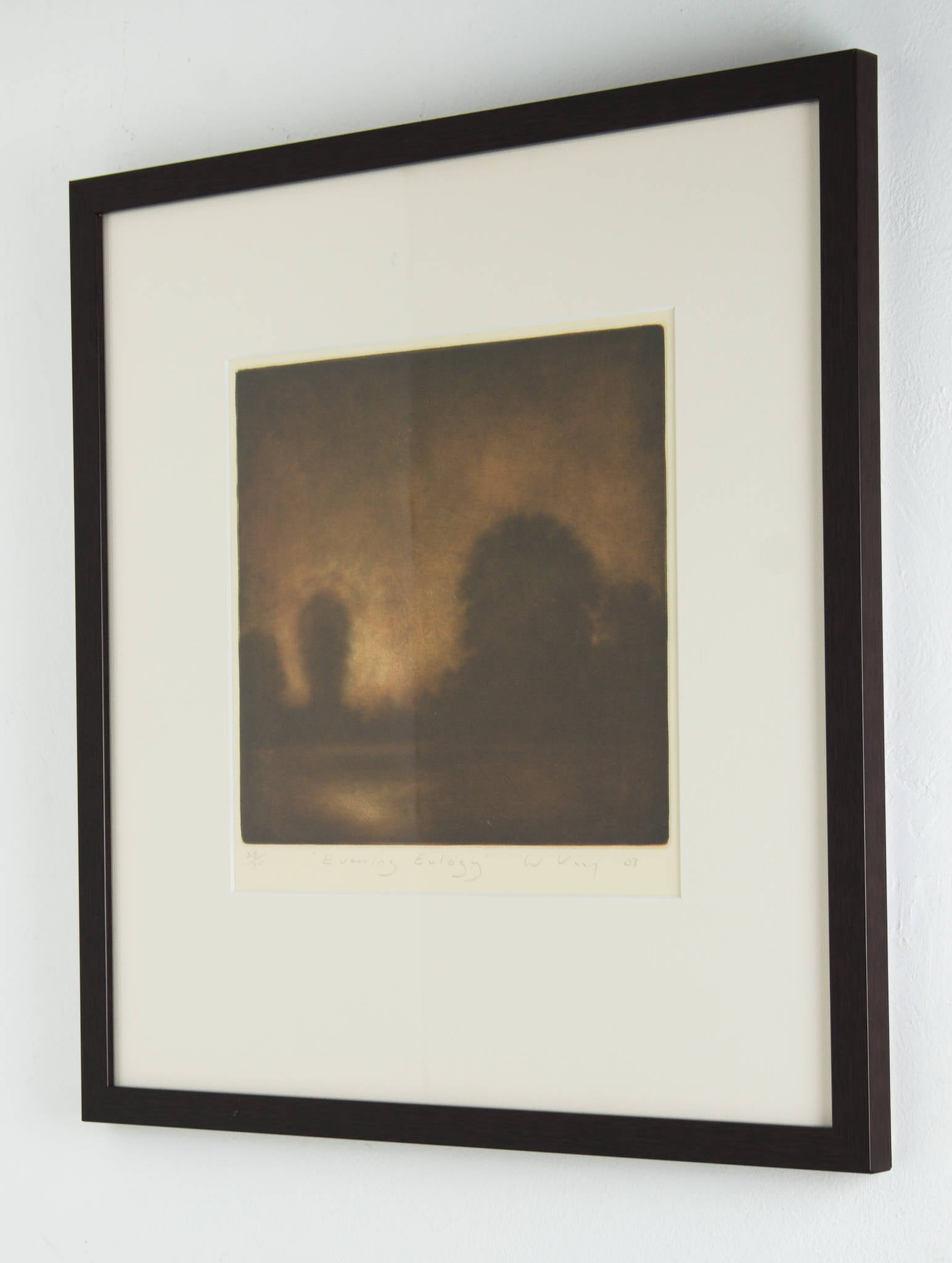 In 'Evening Eulogy' (2003), Wayne Viney transforms the Australian bush into a brooding, twilight-infused vision. Through the painterly potential of etching, he captures not just the landscape, but the emotional resonance it evokes — a quiet, contemplative sense of the sublime. Grounded in real places yet transcending mere observation, this work is a masterly evocation of rock, land, water, and sky.