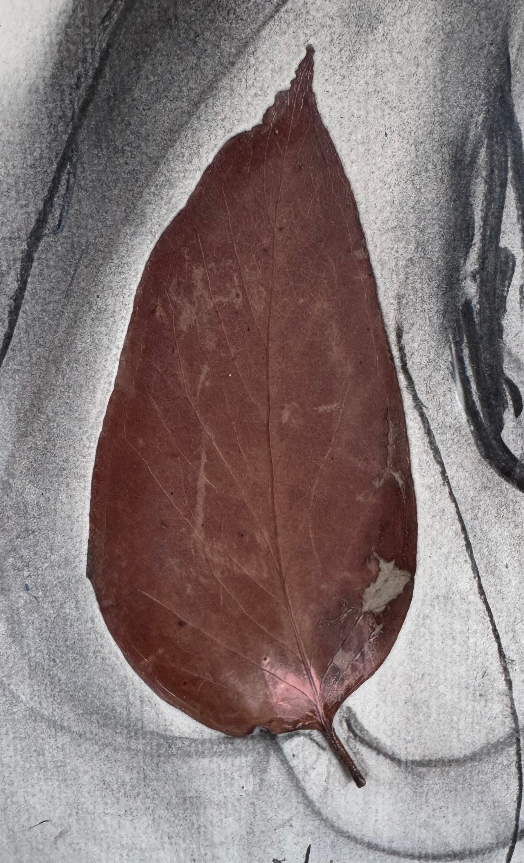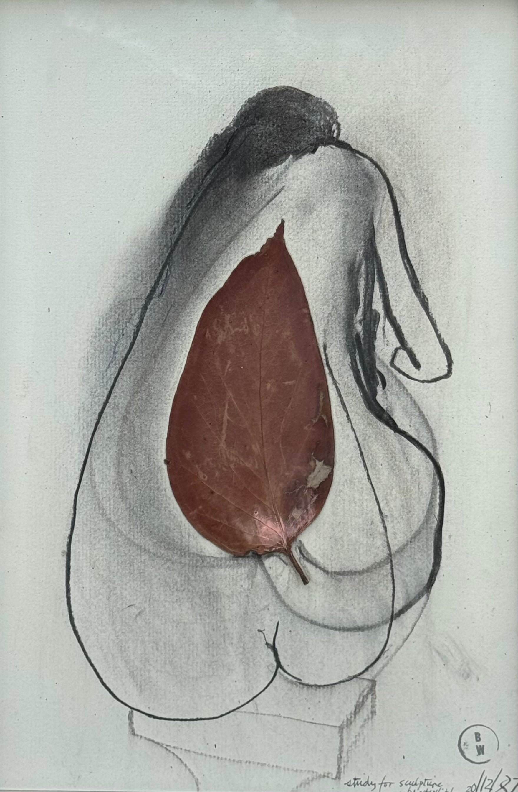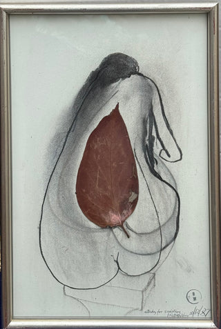 In 'Study for Sculpture', Whiteley creates a sensual drawing of a woman's back, a leaf sitting in the centre, seemingly folded into the curves of her body. This study was created as a commission for Stuart Purves from Australian Galleries, who in 1987 asked artists to create a work based on the inspiration of a gum leaf.
