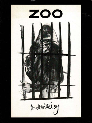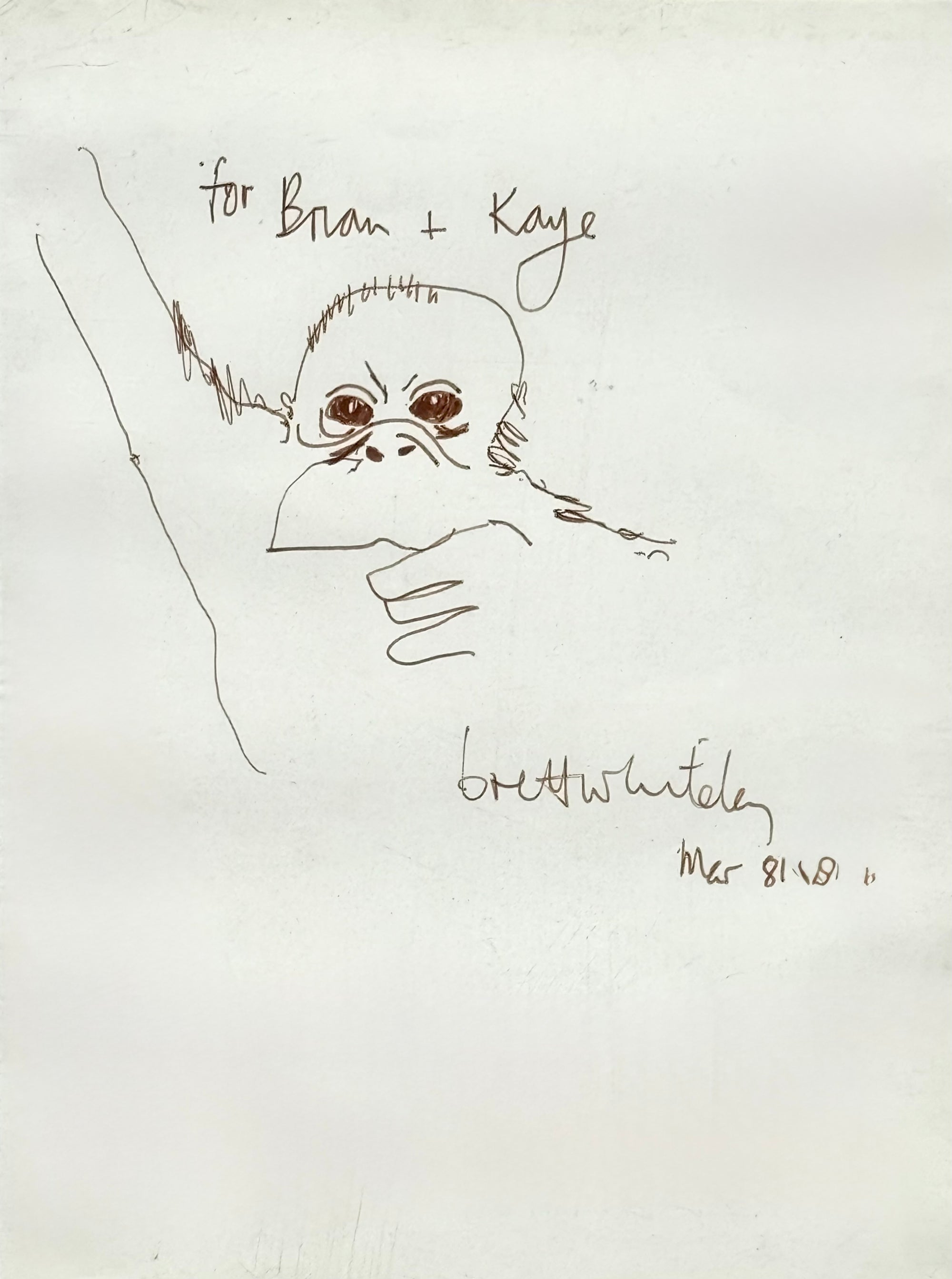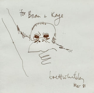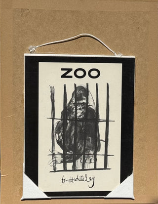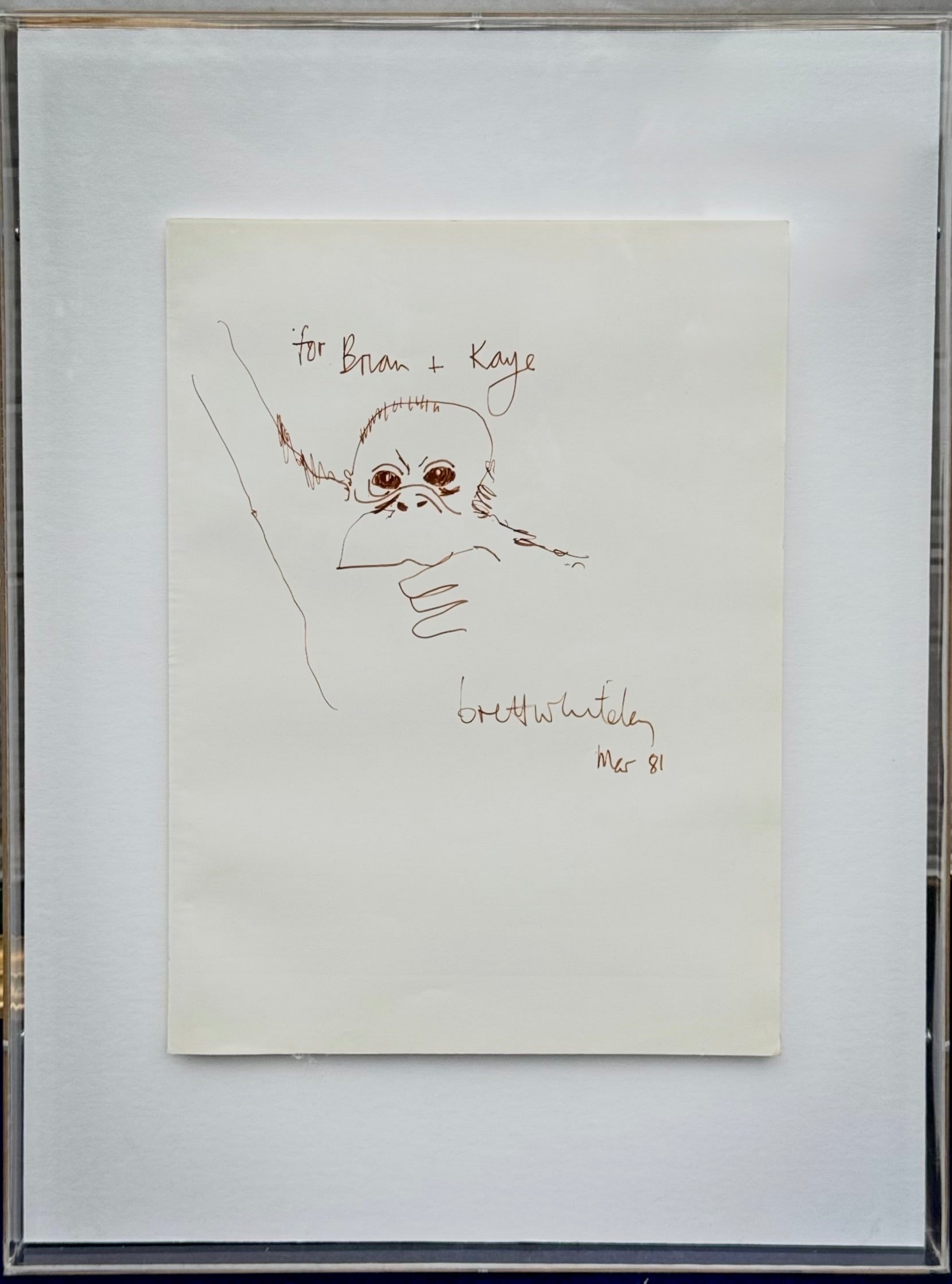 When Whiteley returned to Australia, he lived within walking distance of Taronga Zoo and would often go there to draw. The zoo was a sacred place for Whiteley. An anonymous voyeur among the animals, he found truths about human nature here, a release from city life and infinite formal inspiration. His 1981 drawing 'Young Primate' is a small yet enigmatic portrait of a monkey, its large black eyes staring back at the viewer. This small work is a hand-signed dedication to 'Brian and Kaye' for his book 'Zoo', which is included on the verso of this framed work.