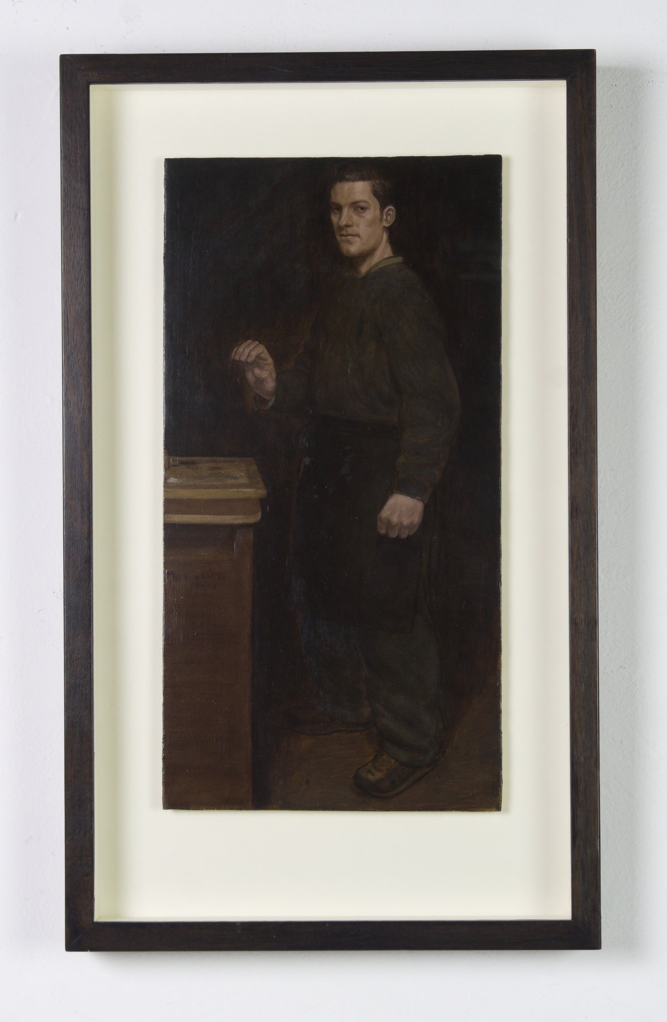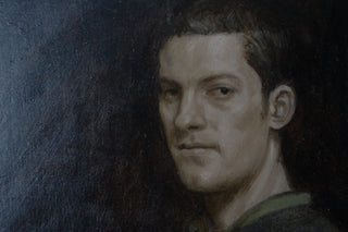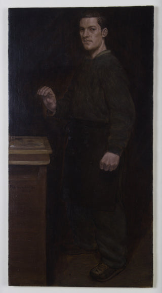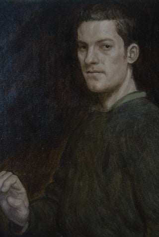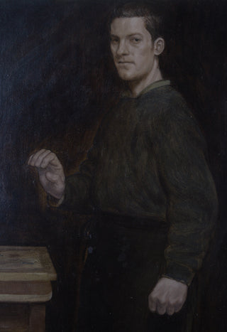‘Portrait in an Apron’ exemplifies Marcus Wills’ rare ability to fuse classical technique with psychological intensity. A solitary, ambiguous male figure - suggestive of a craftsman - emerges from a dark, restrained palette, his pale head and hands illuminated against the creased black fabric of his apron. The composition is spare yet commanding, drawing the viewer into a moment of quiet confrontation.
