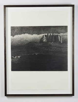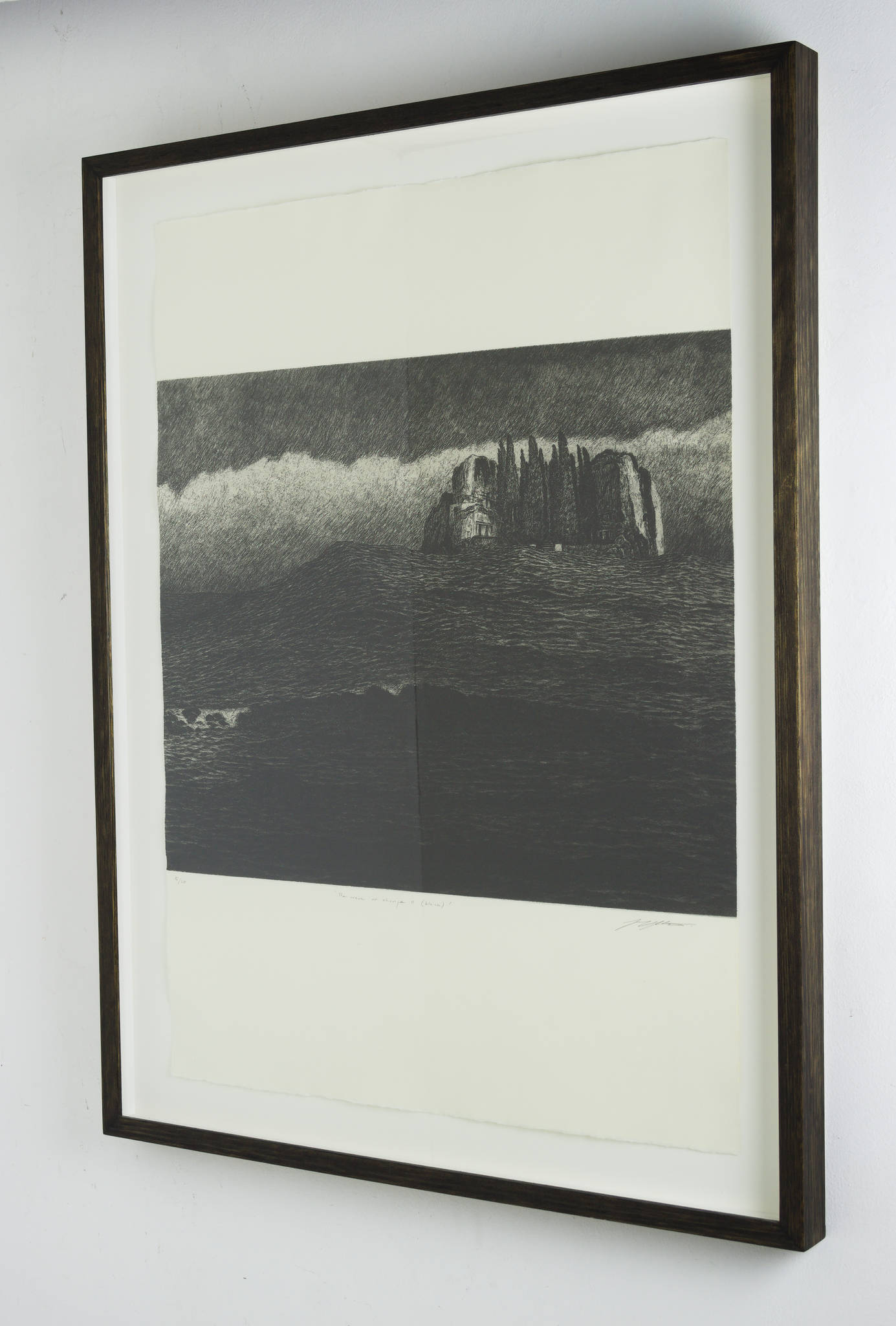 This striking original etching is defined by its dramatic atmospheric power, drawing profound emotional depth through its narrative of enduring humanity and architectural presence against the tumultuous force of nature and time. At the heart of the composition lies a solitary, fortified island—a cypress-crowned promontory featuring a monastic funerary-like structure built into towering cliffs. A deliberate reference to Arnold Böcklin's iconic Isle of the Dead (1880–1886), Wolter crafts a poignant reflection on isolation, spiritual journey, and memory. The island – perpetually facing the relentless 'wave of change' – stands as a timeless symbol of human resilience, contrasting the fragile presence of humanity with the eternal, overwhelming force of the natural world.